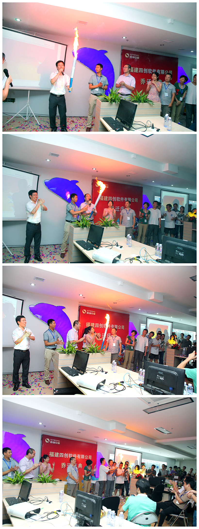当最后一名火炬手到达活动现场时,全场沸腾惊呼。而后,分别来自01年、02年、03年。。。。。。12年、13年的13名员工代表上台,伴随着他们对四创热爱之情的表达,火炬依次从他们手中传递,预示着四创之火一路走来,并传递的更久、更远!