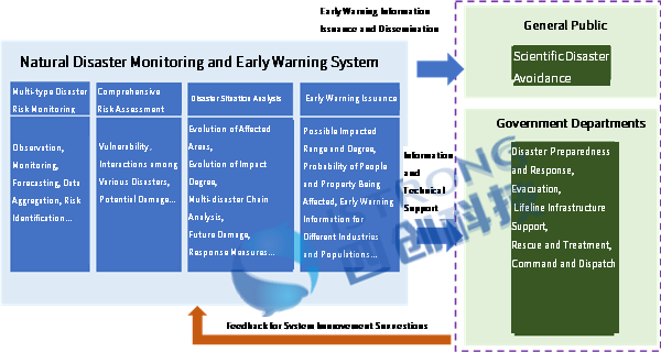The construction of the comprehensive natural disaster monitoring and early warning system mainly consists of four aspects: multi-hazard risk monitoring, integrated risk assessment, disaster situation analysis, and disaster early warning release.