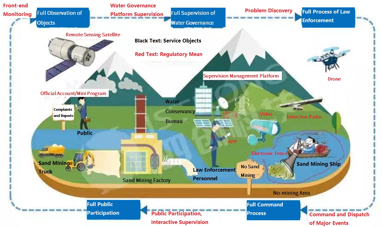Legalized supervision: Empower water administration law enforcement through the legal system, so that there is a basis for law, law must be obeyed, law enforcement must be strict, and violations must be investigated in the process of water administration law enforcement; Standardized disposal: Carry out water affairs cases according to standardized planning process, so that the process of case law enforcement can be investigated and traced; Detailed law enforcement: Discover problems through front-end sensing devices (video, vibration sensors), transmit them to the platform for supervision and evidence collection in real time, and then assign them to on-site law enforcement for disposal and other full-process detailed control; Intelligent application: Identify sand mining ships through video image recognition, so as to achieve intelligent application and reduce workload; Universal participation: Everyone has a responsibility to protect rivers and lakes, and let the public participate in the law enforcement process through complaints, reporting, and advocacy.