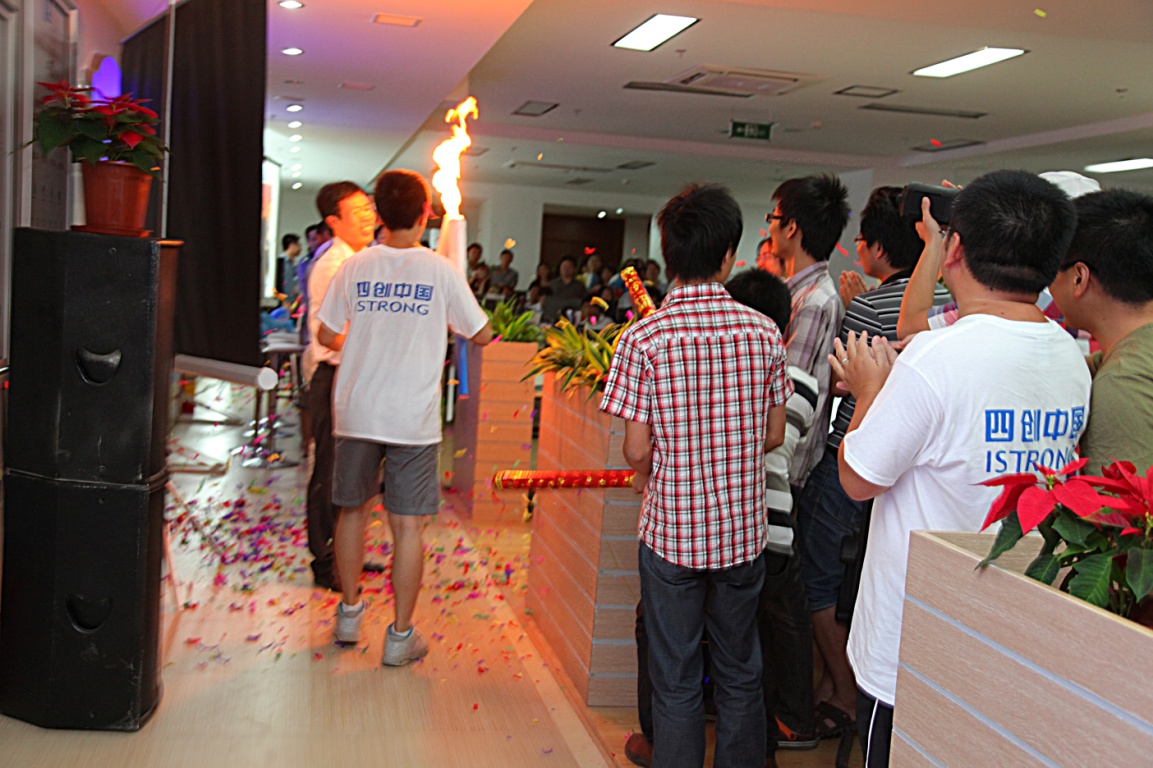 当最后一名火炬手到达活动现场时,全场沸腾惊呼。而后,分别来自01年、02年、03年。。。。。。12年、13年的13名员工代表上台,伴随着他们对四创热爱之情的表达,火炬依次从他们手中传递,预示着四创之火一路走来,并传递的更久、更远!