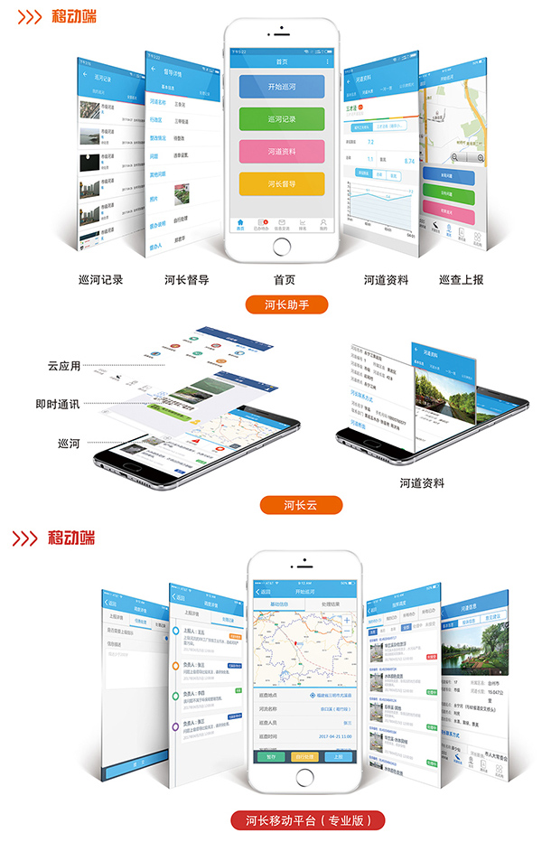 基于平板、手机等移动终端实现河湖信息查询、河湖巡查、河长在线交流等应用,为河长提供简单、便捷的巡河服务。