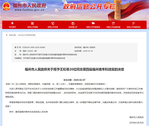近日,福州市人民政府公布了《福州市人民政府关于授予王松等20位同志第四届福州青年科技奖的决定》,四创科技产品总监、高级工程师黄敏入选名单获表彰奖励。