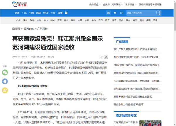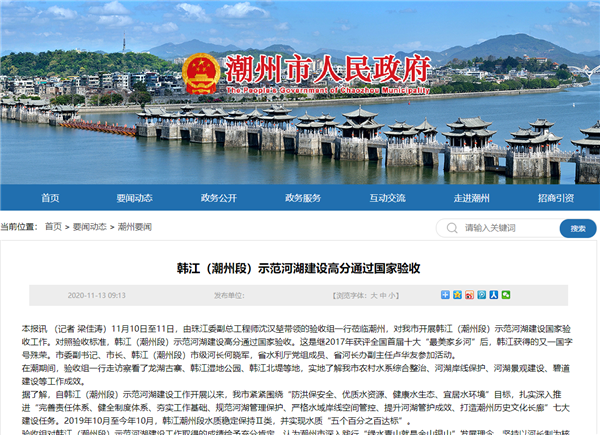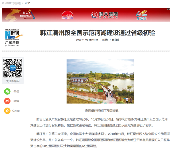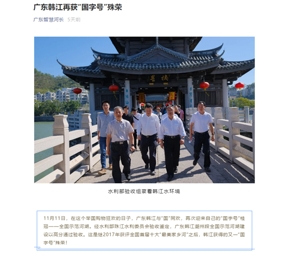 人民日报、新华网、潮州市人民政府官网、南方新闻网、广东智慧河长、广州日报等多家官方媒体争相对韩江潮州段全国示范河湖验收做详细报道!