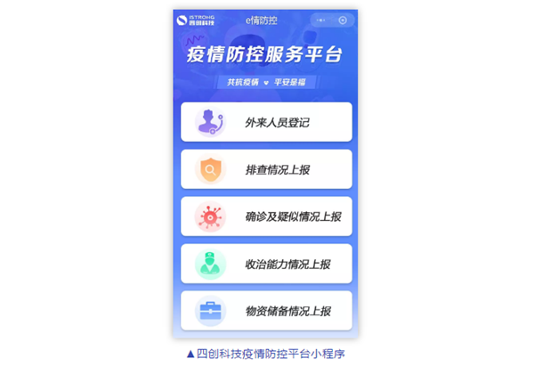 为充分利用信息化手段科学有效应对疫情,发挥软件和信息技术产品在疫情防控中的重要作用,福州市工业和信息化局近期公开征集了可用于疫情防控的软件和信息技术服务产品,并形成《福州市疫情防控软件和信息技术服务产品参考目录(第二批)》,四创科技自主研发的“新冠肺炎实时动态小程序”、“疫情防控应急指挥平台”、“疫情应急物资管理平台”、“预警信息展播系统”等4款产品入选此目录名单,协助各级政府打赢疫情防控阻击战。