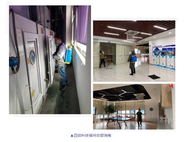 在疫情防控期间,四创科技中高管拧成一股绳,成立疫情防控工作领导小组,及时传达落实省政府和集团工作部署并准确报送各类疫情防控的信息;线上组织召开“疫情防控与2020年开春工作安排交流会”,在做好疫情防控的同时创新工作方式,保障各项工作有序开展;加大员工健康、行程摸排工作力度,时刻关注员工健康安全;积极做好办公区域消毒,为员工返岗提供安心工作环境;调用一切资源筹备口罩物资,并寄给工作在一线的运维、巡河人员,为他们的疫情防控再添一道屏障。