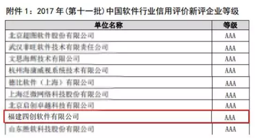 中国软件行业协会根据商务部办公厅、国资委《关于印发第二批行业信用评价试点单位名单的通知》(商信用字[2008]1 号)等有关文件精神,在商务部和国资委的统一部署下,在工业和信息化部的业务指导下,本着“自愿、诚信、公正、科学、严格”的原则,经企业主动申报、各省市软件行业协会推荐、评审资格审查、中国软件行业协会初评、专家会审议等严格工作程序,四创软件凭借强大的综合实力和极好的信用,在2017 年(第十一批)企业信用评价中成果摘得AAA级最高评级。