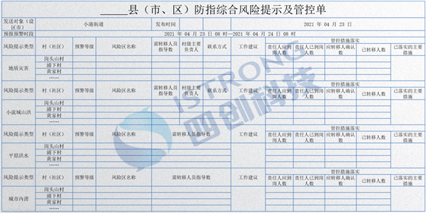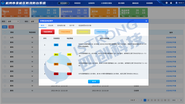 余杭区含有城市内涝点、地质灾害点等风险源,以台风暴雨灾害为导向,不同灾害等级情况下还会有多项风险源信息。系统可通过监测数据系统线上绘制出余杭区风险一张图(《防汛防台综合风险提示单》)、管控一张表(《防汛防台综合风险管控表》)。当灾害来临,用户能够根据对应的灾害等级进行风险的动态预警,通过风险提示单的下达和管控措施的处置防控情况,动态更新各辖区风险等级,启动对应应急响应预警、应急预案。