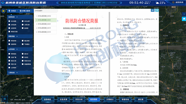 余杭区应急管理局围绕“不死人、少伤人、少损失”的目标,牢固树立“防大汛、抗大灾”的责任意识,通过防汛抗旱专题系统建设,进一步强化防汛抗旱信息共享和综合应用,提升余杭区发生灾害的应急处置能力,防汛抗旱防台风、减灾救灾指挥决策水平。