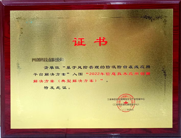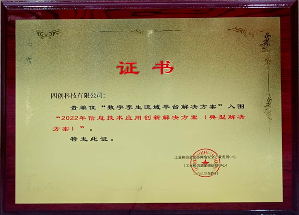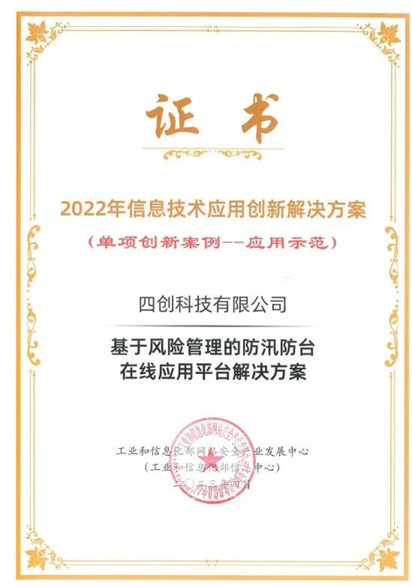 会上,正式发布2022年数字技术融合创新应用解决方案(即:信息技术应用创新解决方案)征集工作成果,四创科技自主研发的“基于风险管理的防汛防台在线应用平台解决方案”、“数字孪生流域平台解决方案”成功入选典型解决方案,其中,“基于风险管理的防汛防台在线应用平台解决方案”被评为应用示范单项创新案例。此前,这两项案例均已入选福建省信息技术应用创新解决方案典型案例集。